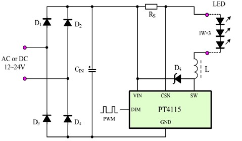 水底灯大多采用AC24V安全电源,因此完全可以选用Vin=6-30V、Iout=1.2A,系统应用零部件很少的PT4115来做驱动电源,它用四个肖特基二极管做整流桥,一个滤波储能电容器、一个输出电流设定电阻、一个续流肖特基二极管和一个续流电感器。